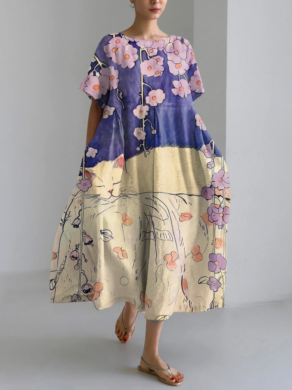 Vintage Japanese Art Flower Cat Print Linen Blend Maxi Dress