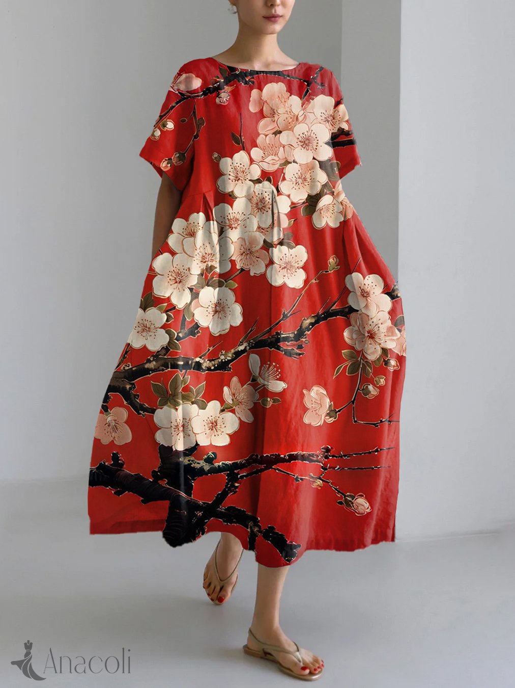 Vintage Japanese Art Flower Print Linen Blend Maxi Dress
