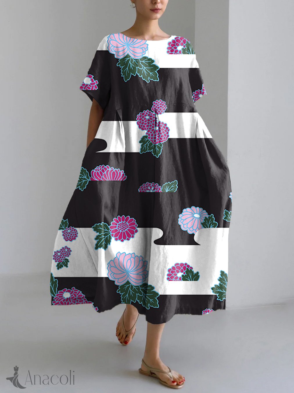 Vintage Japanese Art Flower Print Linen Blend Maxi Dress