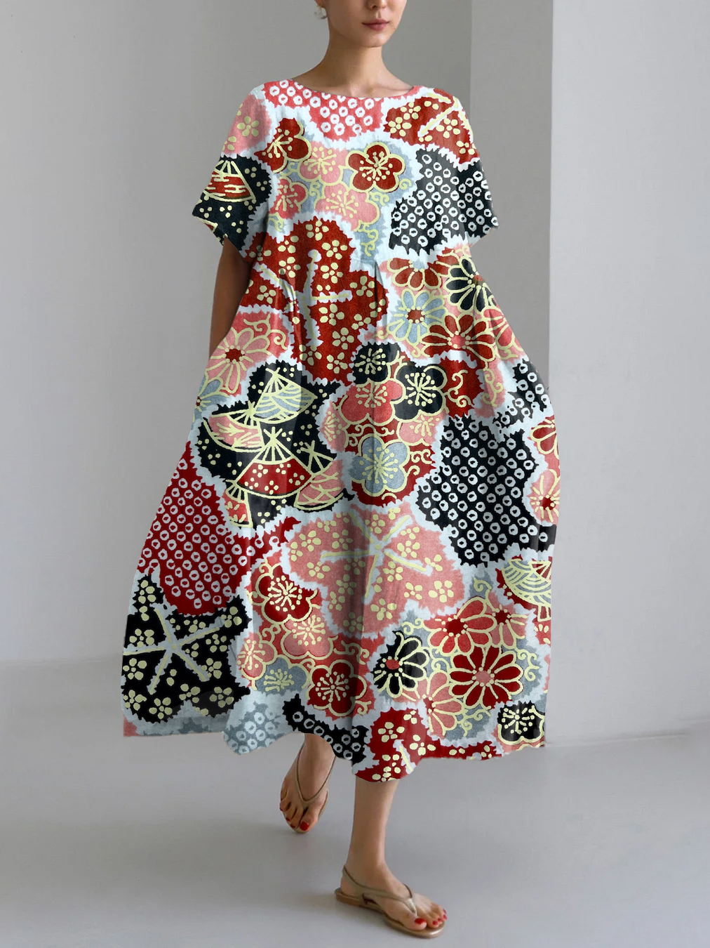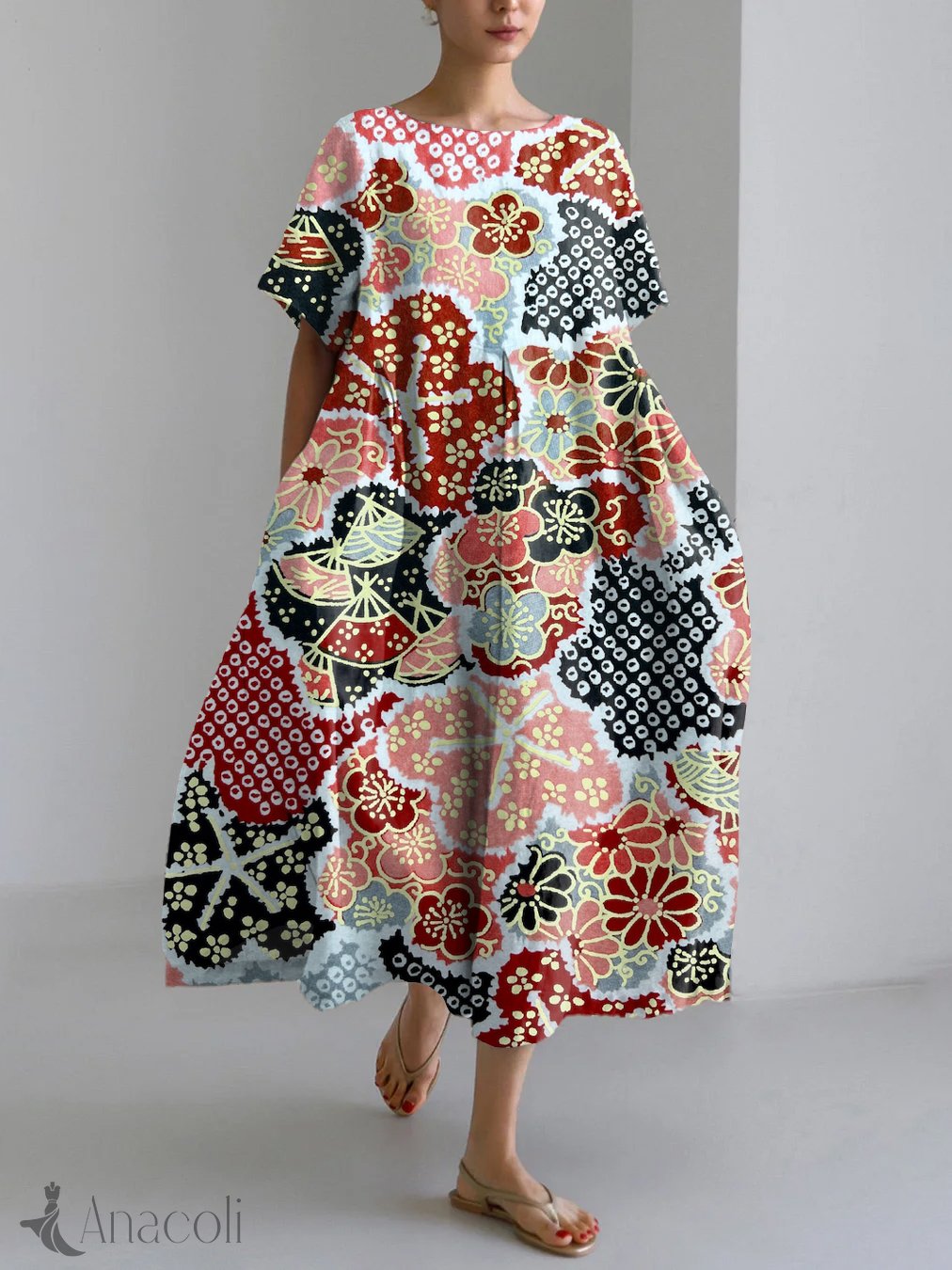 Vintage Japanese Art Flower Print Linen Blend Maxi Dress