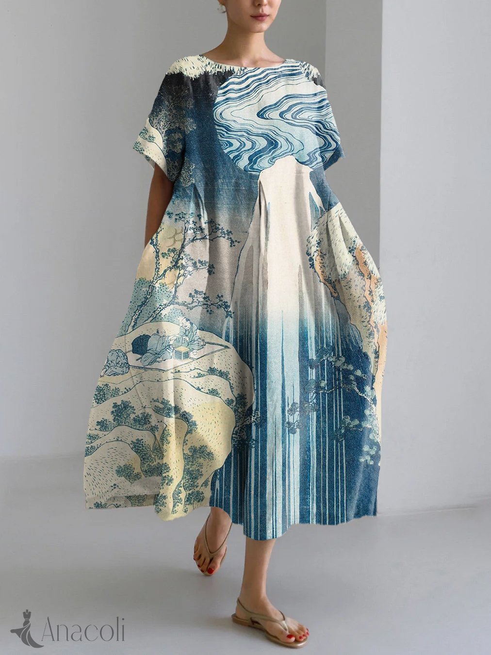 Vintage Japanese Art Pattern Linen Blend Maxi Dress