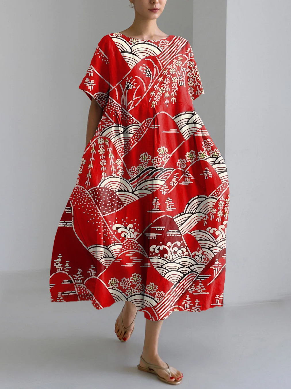 Vintage Japanese Art Print Linen Blend Maxi Dress
