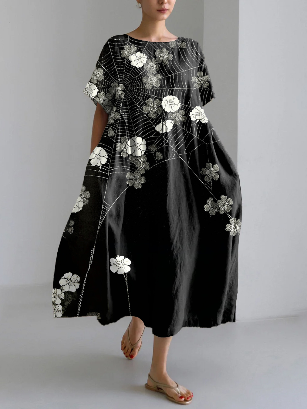 Vintage Japanese Art Spider Web Flower Print Linen Blend Maxi Dress