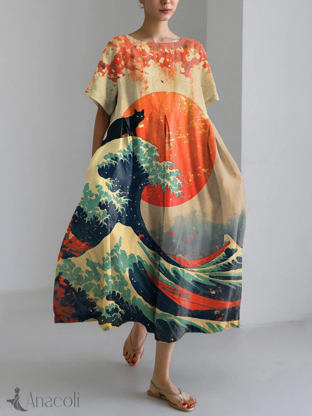 Vintage Japanese Cat Art Print Linen Blend Maxi Dress