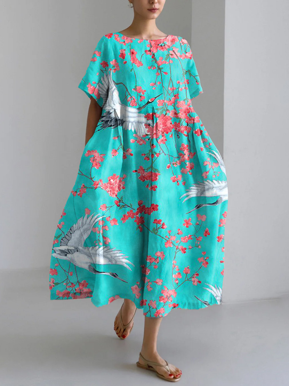 Vintage Japanese Crane Art Print Linen Blend Maxi Dress