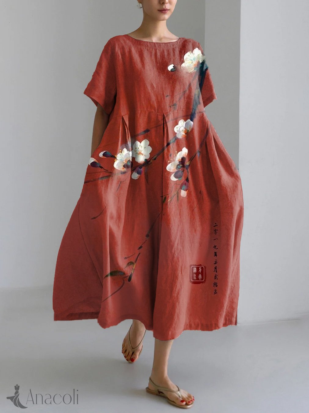 Vintage Japanese Plum Blossom Art Print Linen Blend Maxi Dress