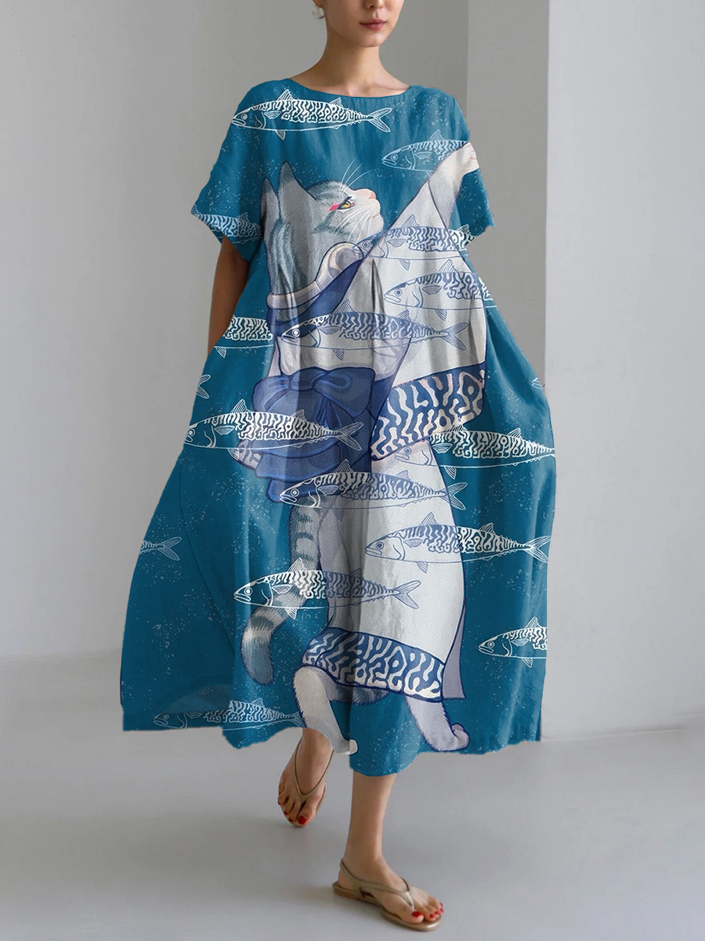 Vintage Kimono Cat Pattern Linen Blend Maxi Dress