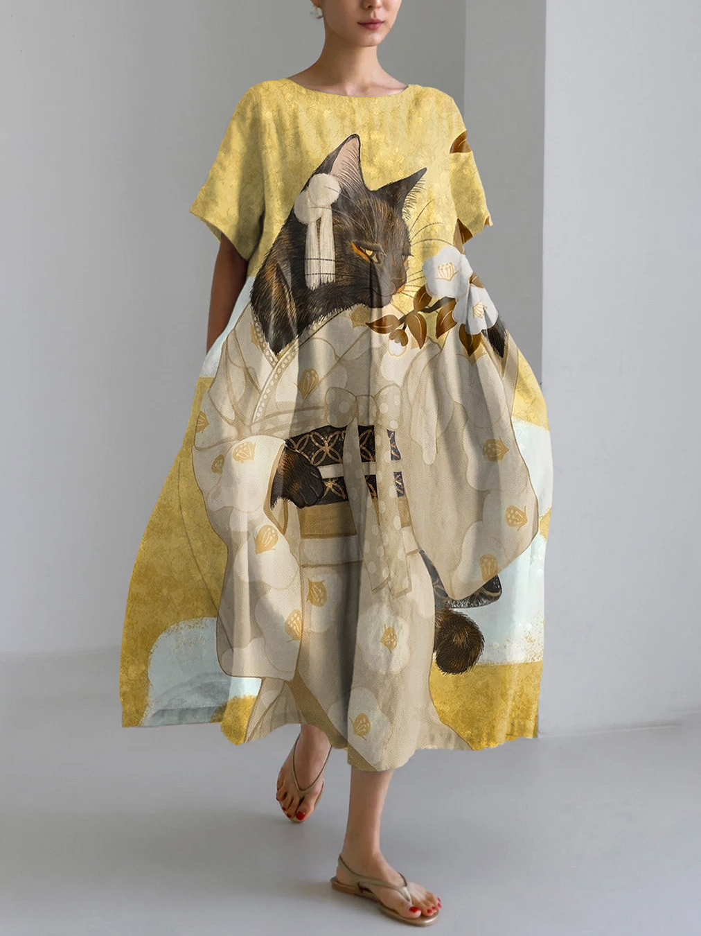 Vintage Kimono Cat Pattern Linen Blend Maxi Dress