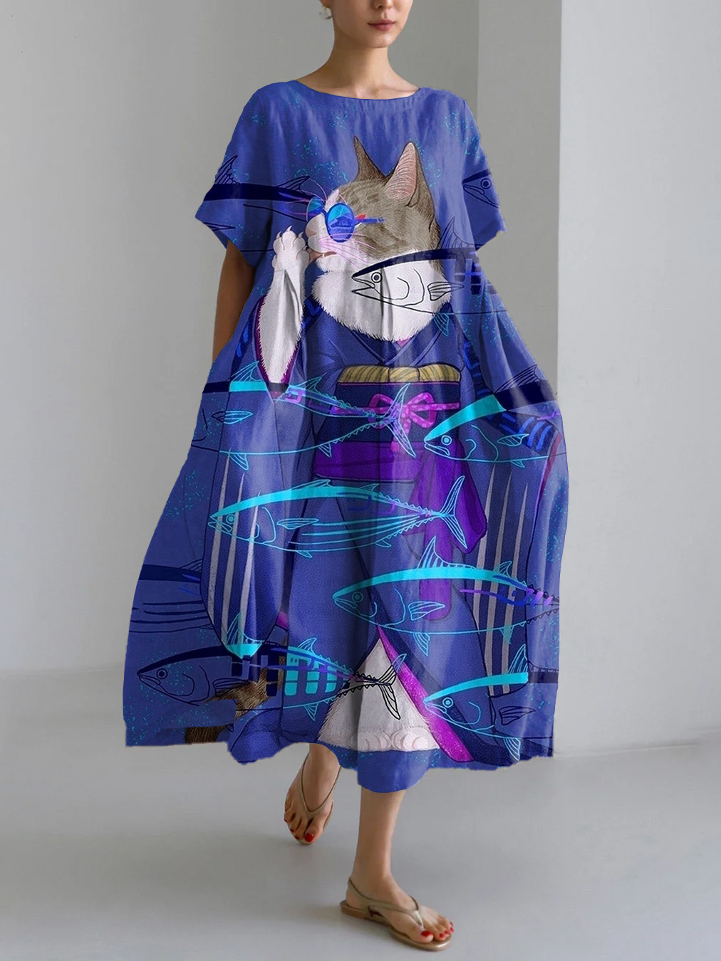 Vintage Kimono Cat Pattern Linen Blend Maxi Dress