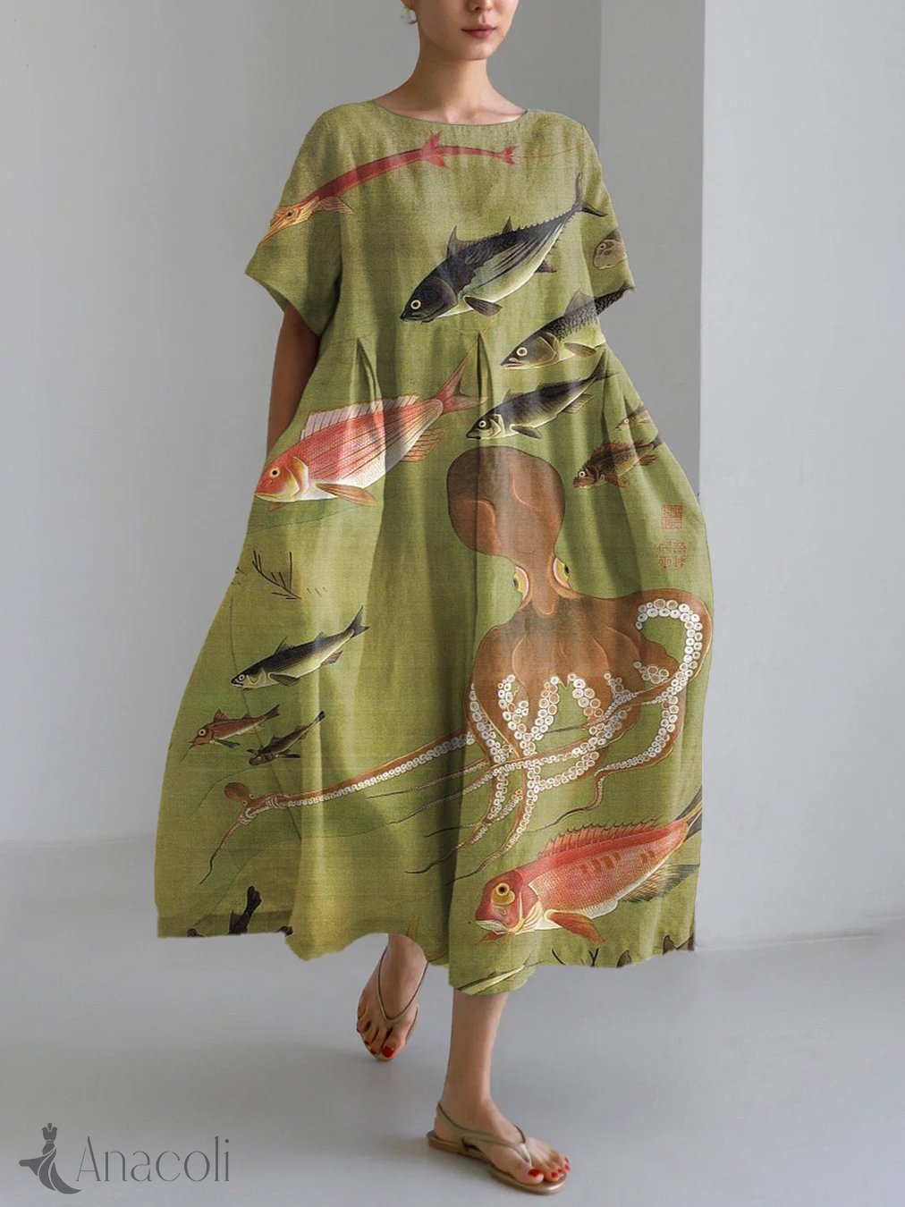 Vintage Ocean Art Print Linen Blend Maxi Dress