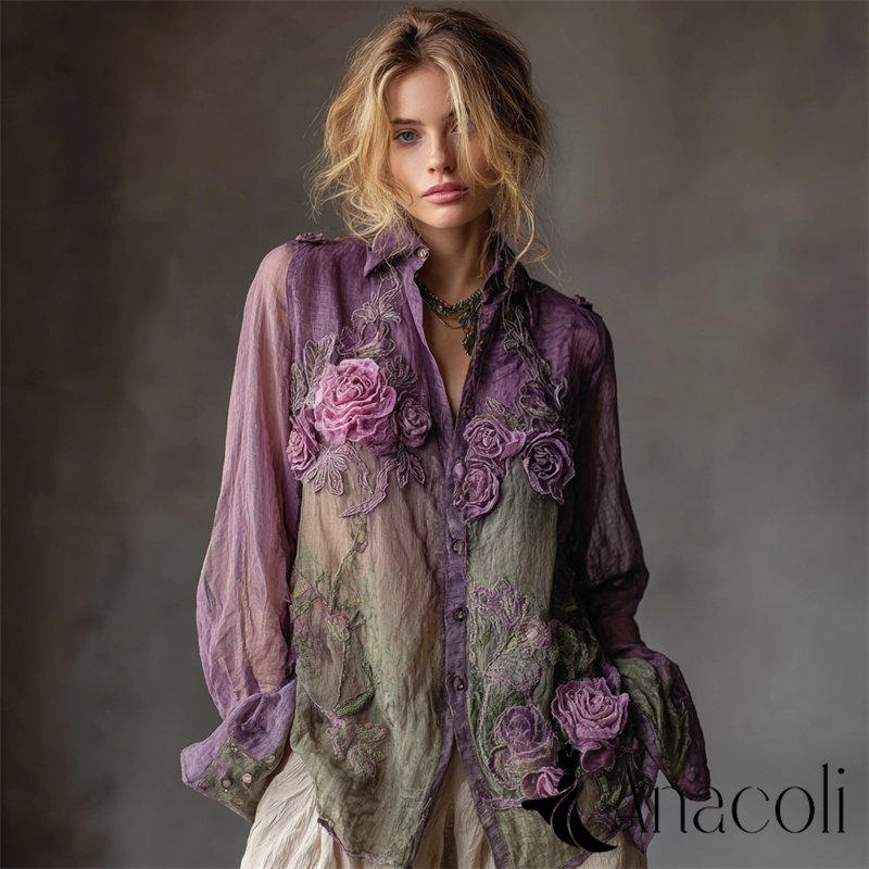 Vintage Roses Fiber Art Embroidered Contrast Flowy Linen Blouse