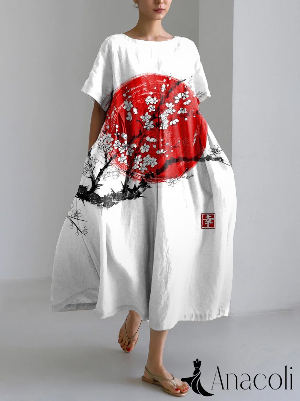 Vintage Sunrise Japanese Art Print Linen Blend Maxi Dress