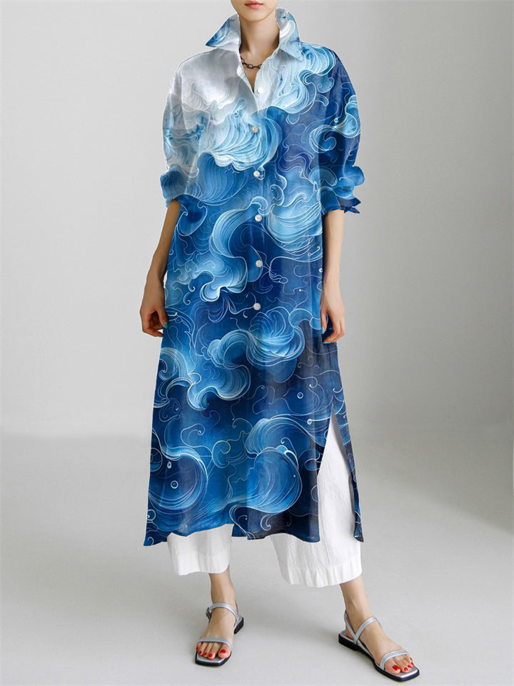 Wave Japanese Art Print Long Sleeve Slit Shirt Dress