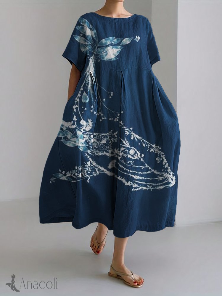 Whale Floral Cyanotype Art Linen Blend Maxi Dress