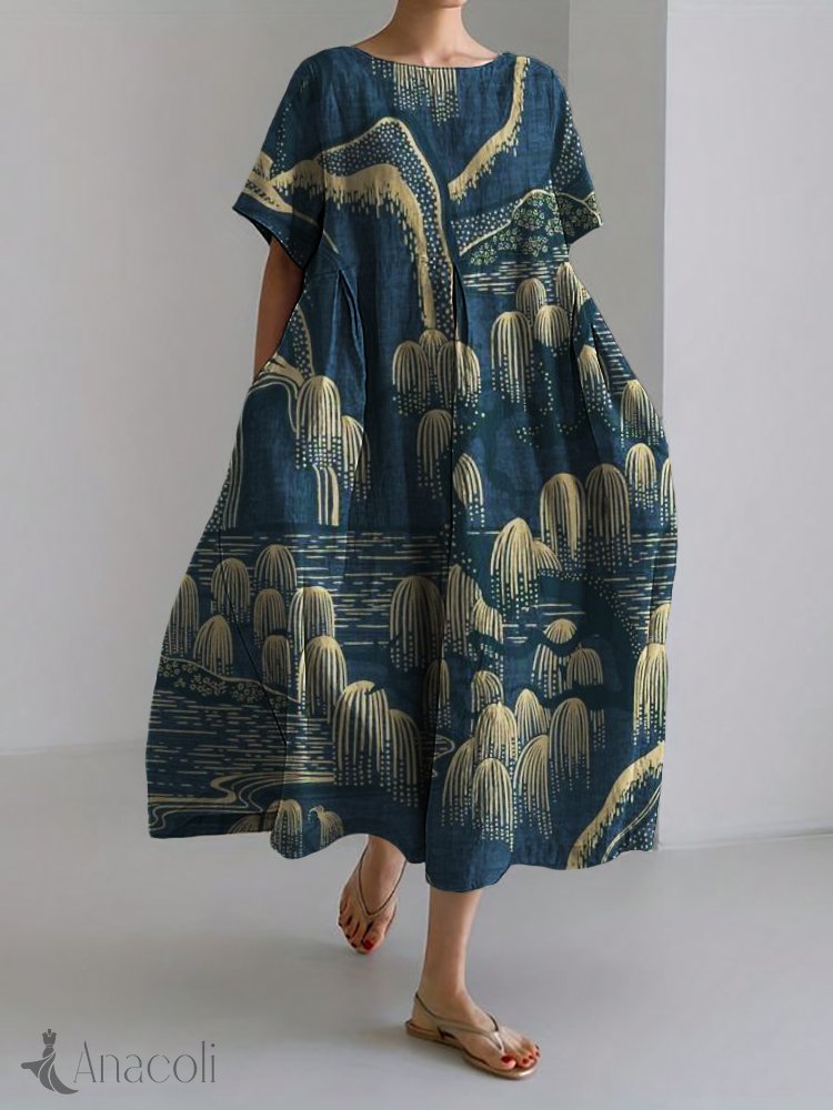 Willow Trees Mountains Landscape Japanese Art Linen Blend Maxi Dress
