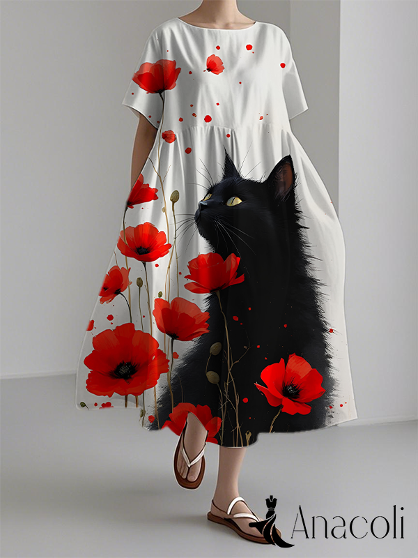 Women's Black Cat And Red Flowers Painting Print Short Sleeve Dress