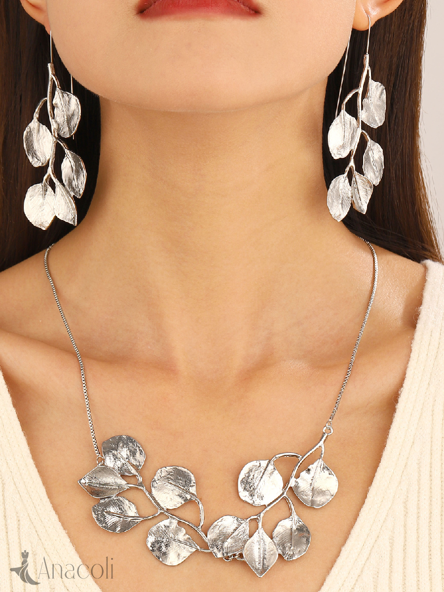 Women's Metal Leaf Necklace Earrings Set