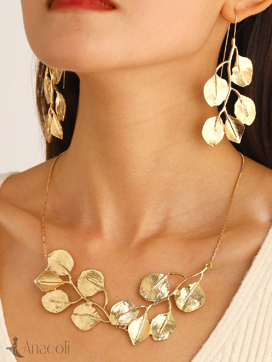 Women's Metal Leaf Necklace Earrings Set
