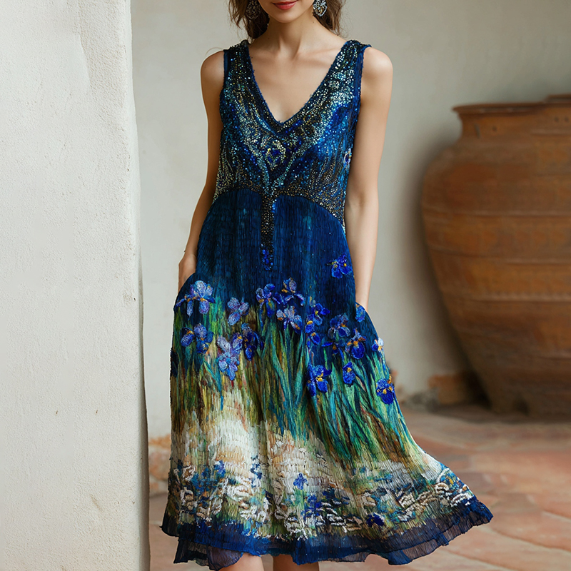 Women's Oil Painting Embroidered Iris Sequined Midi Dress