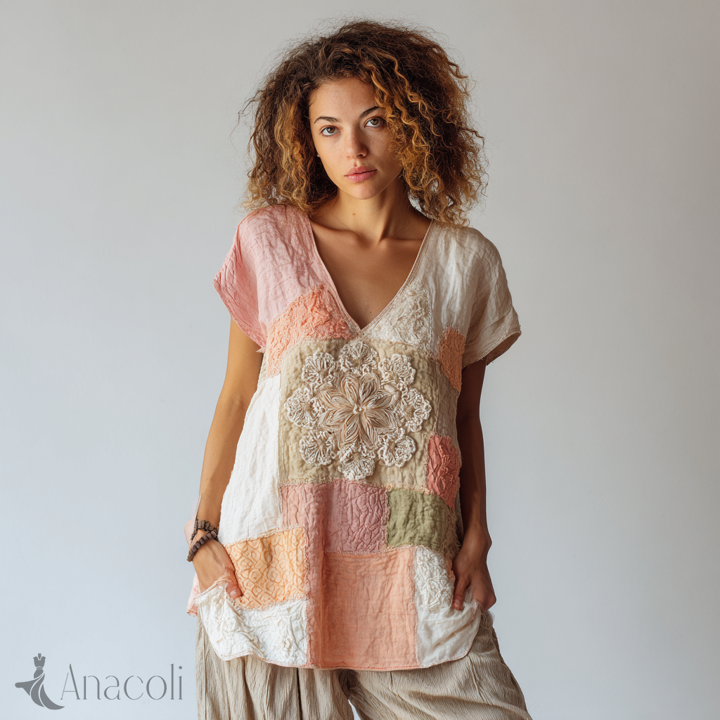 Women's Retro Floral Art Stitching Short Sleeve T-shirt