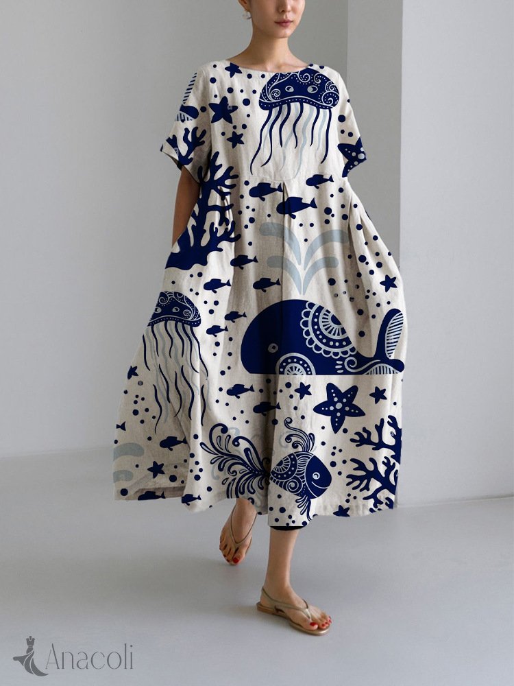 Women's Whale & Jellyfish Print Loose Round Neck Medium Length Skirt Dress