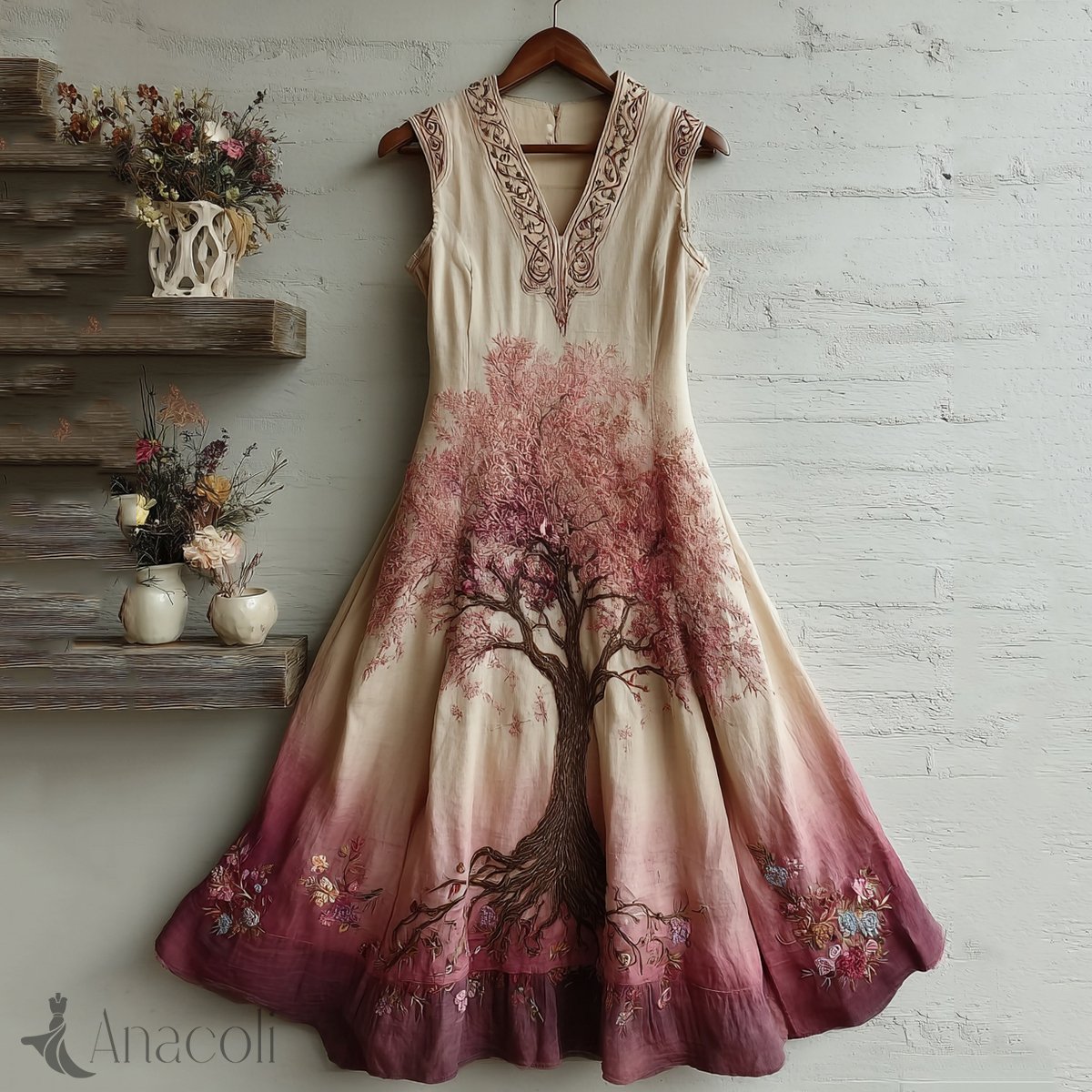 Women's Tree Of Life Pink Ribbon Embroidery Tank Maxi Dress