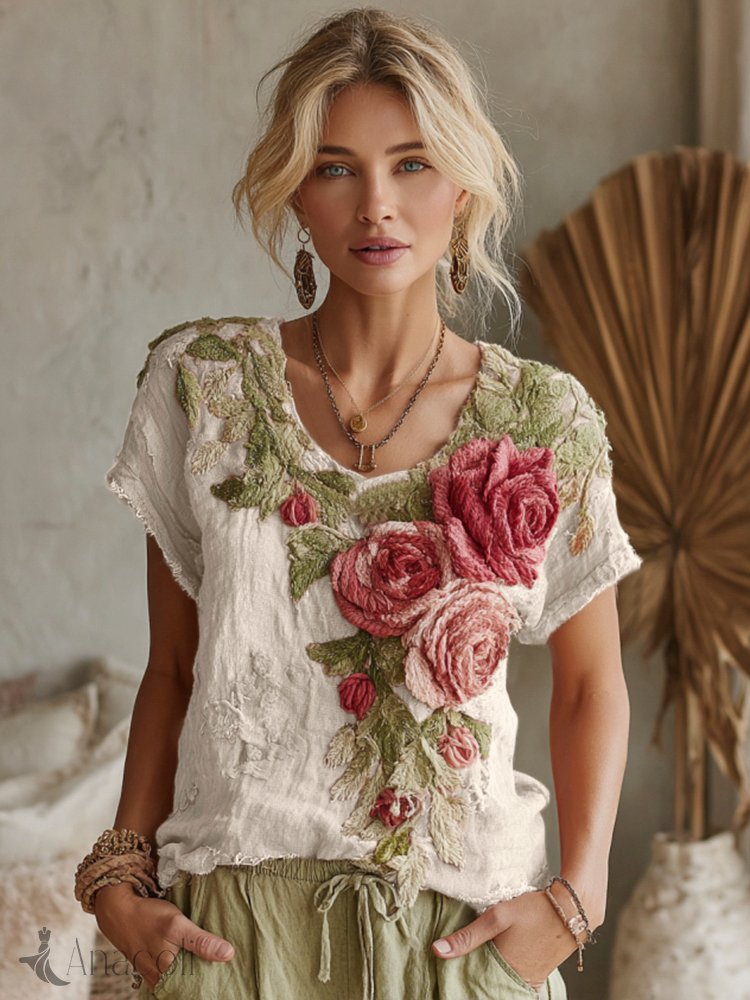 Women's Vintage Floral Art Linen Crew Neck Short Sleeve T-shirt